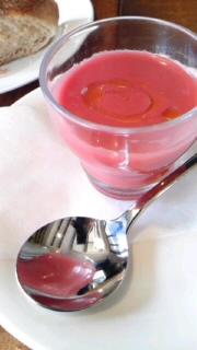 デザートみたいにオシャレな器に入った、ピンク色が綺麗な冷たいスープでした。